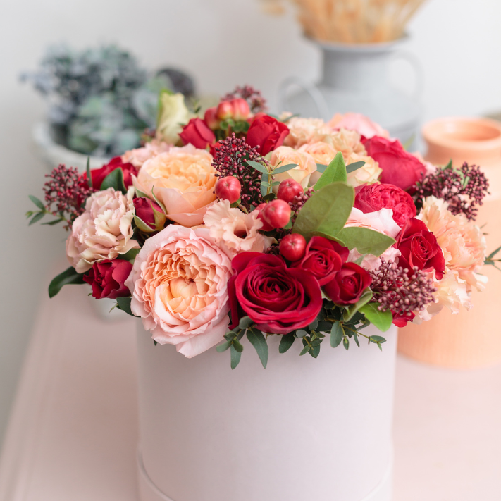 This arrangement includes roses, spray roses, limonium, eucalyptus, and greens in a round pink hat box (size 3) measuring 19.5 cm in diameter and 6 cm tall or 7.5 inches in diameter and 2.4 inches tall. If you wish, you can add any wine, champagne, beer, liquor or gourmet gifts from our list of add-ons to this gift.